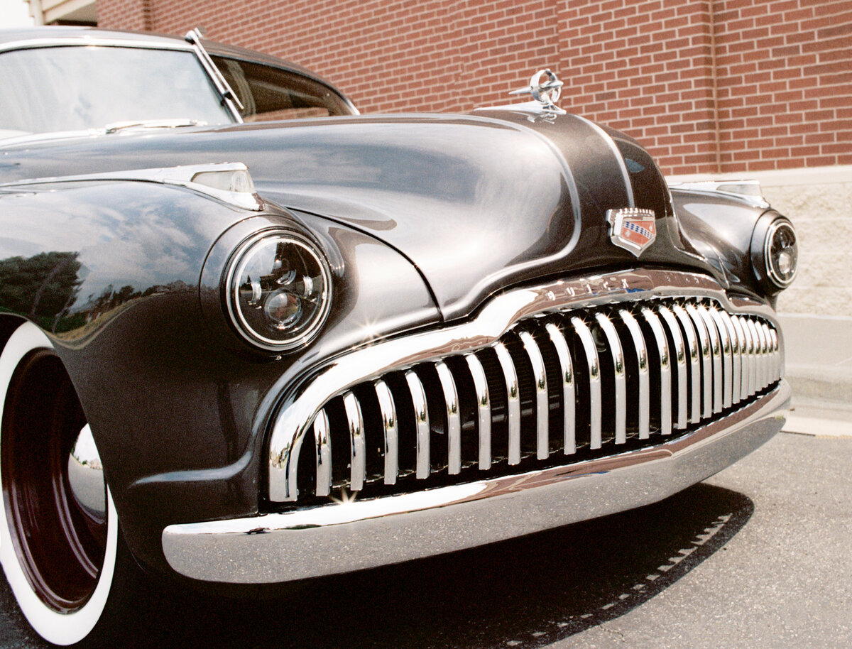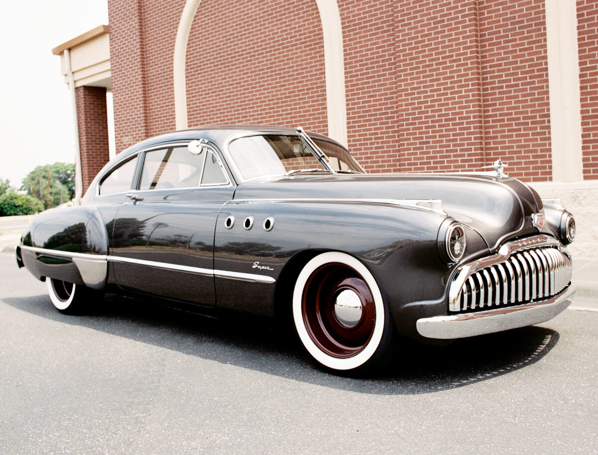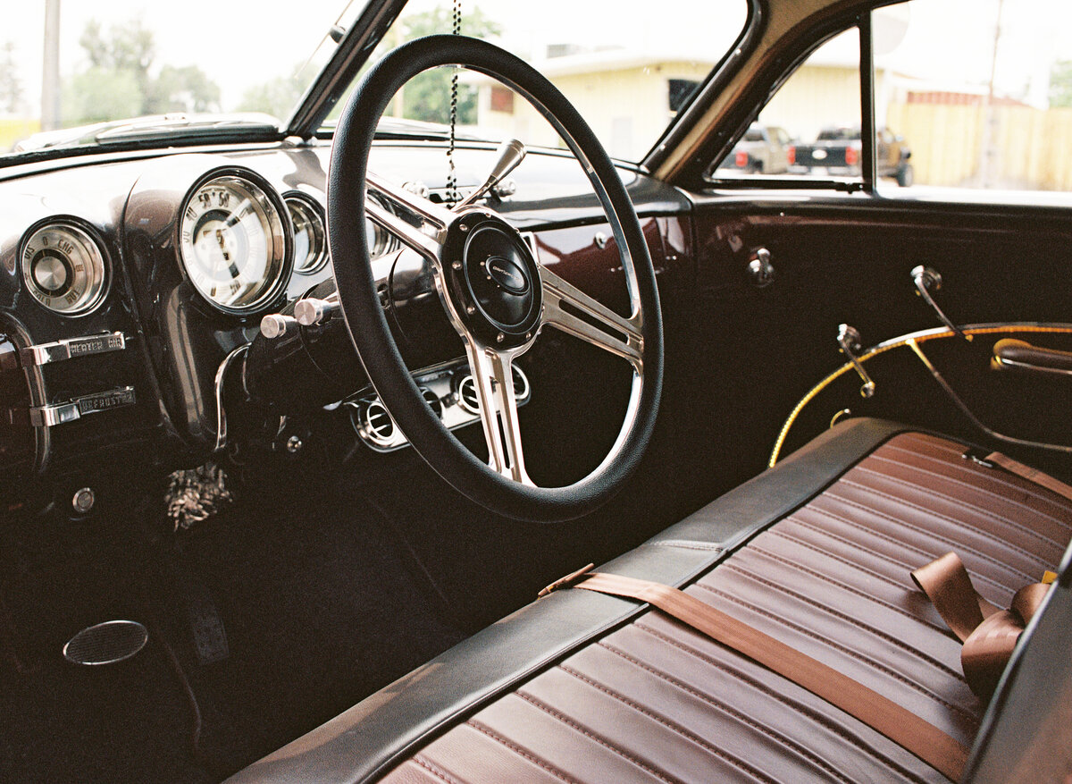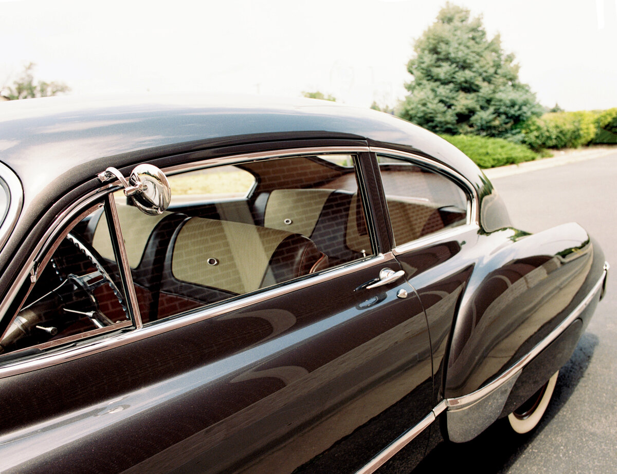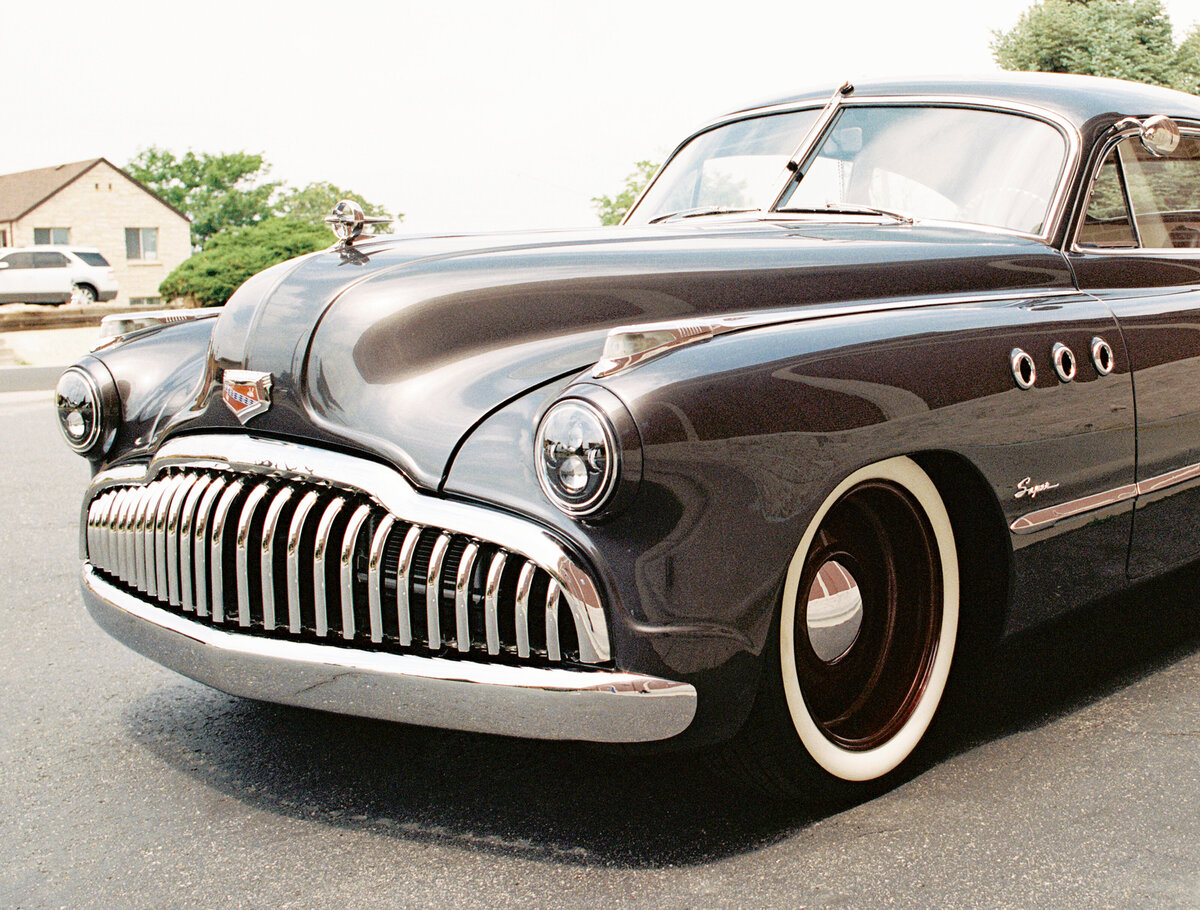 Mile High Classics restored the body and paint on this 1949 Buick Super, and created a custom interior. We replaced the front section of the chassis and converted the rear suspension to a 4-link coil-over suspension with a 9-inch Ford rear axle and hydroboost powered 4-wheel Willwood disc brakes. We also installed a Chevy LS 376 engine with a 4L60 automatic transmission. The trunk is custom upholstered with a one-of-a-kind liquor bar. For the body, we fabricated a custom front bumper, relocated the taillights, frenched in the rear fenders, and removed the drip rails.