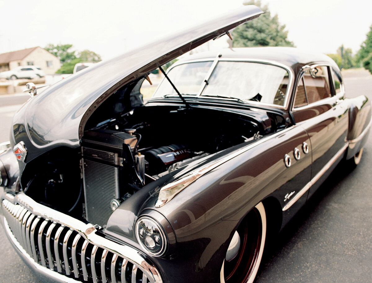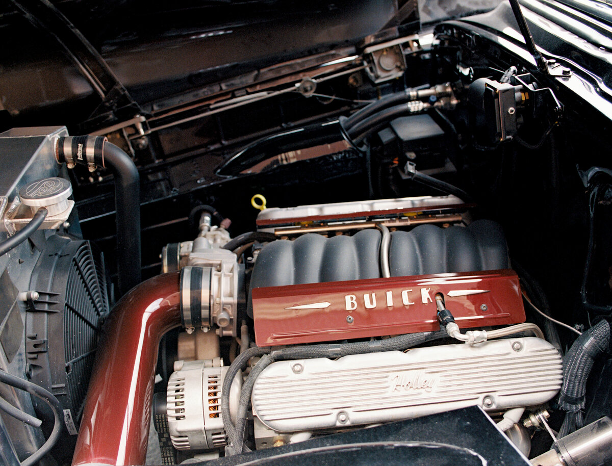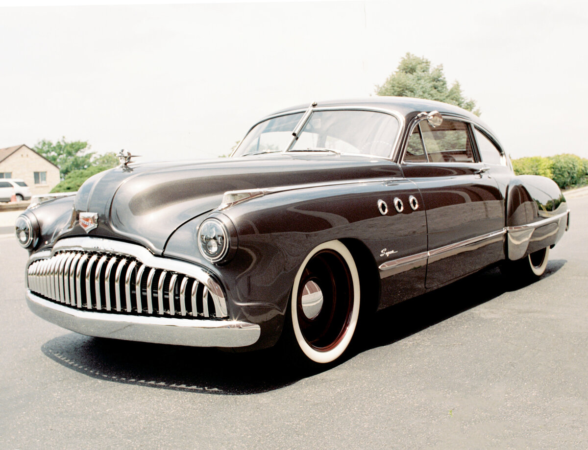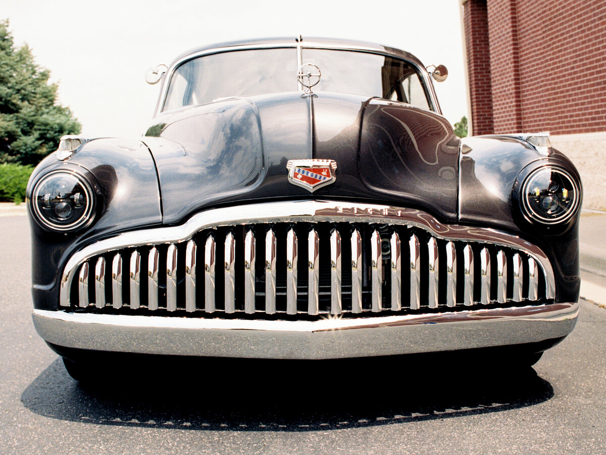 Mile High Classics restored the body and paint on this 1949 Buick Super, and created a custom interior. We replaced the front section of the chassis and converted the rear suspension to a 4-link coil-over suspension with a 9-inch Ford rear axle and hydroboost powered 4-wheel Willwood disc brakes. We also installed a Chevy LS 376 engine with a 4L60 automatic transmission. The trunk is custom upholstered with a one-of-a-kind liquor bar. For the body, we fabricated a custom front bumper, relocated the taillights, frenched in the rear fenders, and removed the drip rails.
